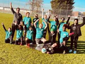 Nach dem Seitenwechsel blieben wir weiterhin motiviert und erhielten nach zwei Minuten das 4:0. Aber auch Pforzheim gab noch nicht auf und erzielte nach einem Freistoß das 4:1. Doch 5 Minten später kamen wir wieder zum Schuss und es fiel erneut ein Tor. Das 5:1. Die Uhr zeigte die letzten zehn Minuten an und Pforzheim gab sich noch nicht geschlagen. Das gegnerische Team schoss innerhalb dieser 10 Minuten noch zwei Tore. Somit stand es 5:3 für uns. Wir Mädels warteten gespannt und voller Nervosität auf den Schlusspfiff der Schiedsrichterin. Als es endlich so weit war stürmten wir alle zusammen und feierten. Wir hatten es geschafft, wir waren Erster und somit, obwohl noch ein Spiel aussteht, vorzeitiger Meister der Winterstaffel 2022.